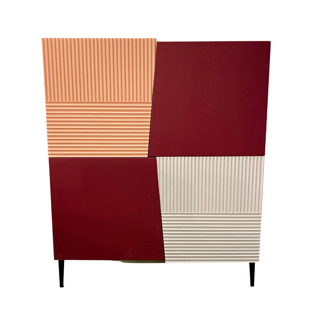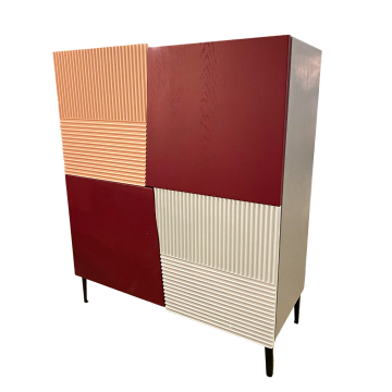 Si lo miras de frente, este icónico armario de la colección Zero.16 está dividido en cuatro secciones. La discontinuidad que presentan las puertas asimétricas suaviza el rigor de los contornos, mientras que la secuencia horizontal y vertical de la madera tallada se alterna según un patrón establecido. El lacado de poro abierto conserva la naturalidad y la calidez del roble macizo con un efecto de elegancia espontánea.