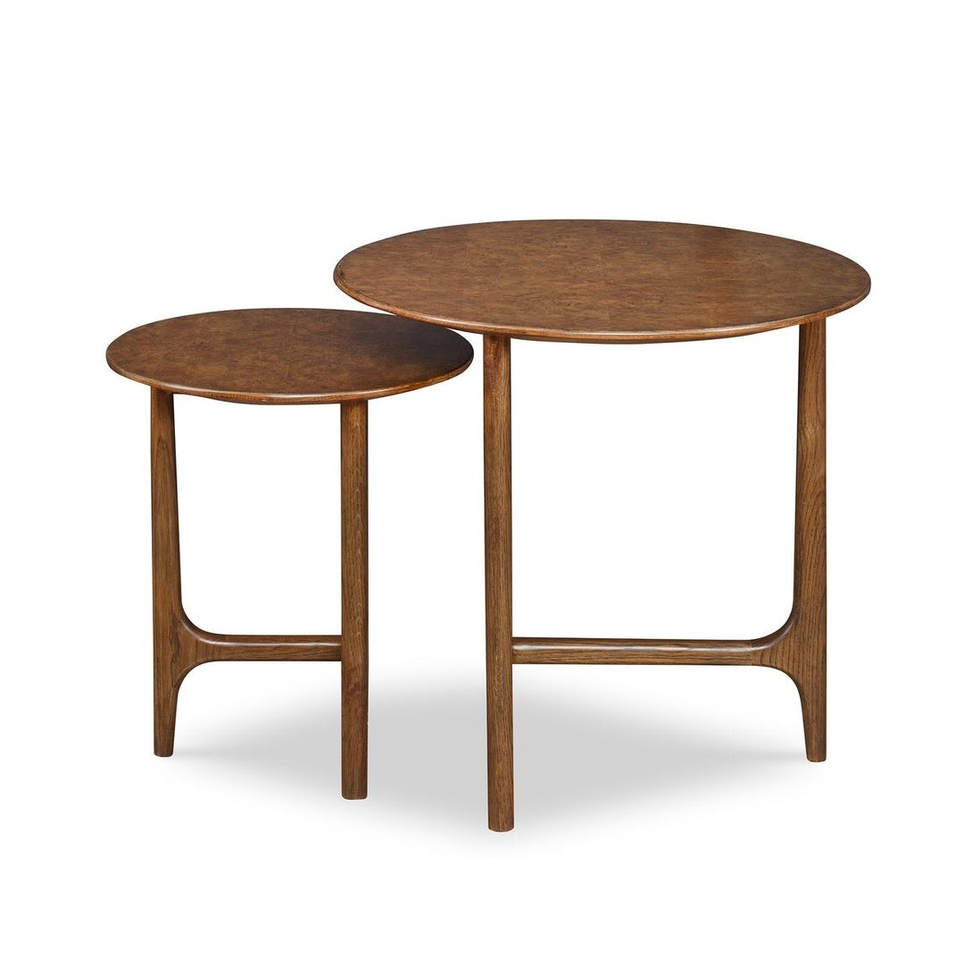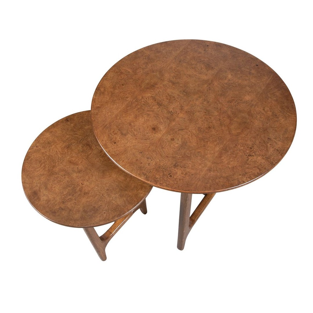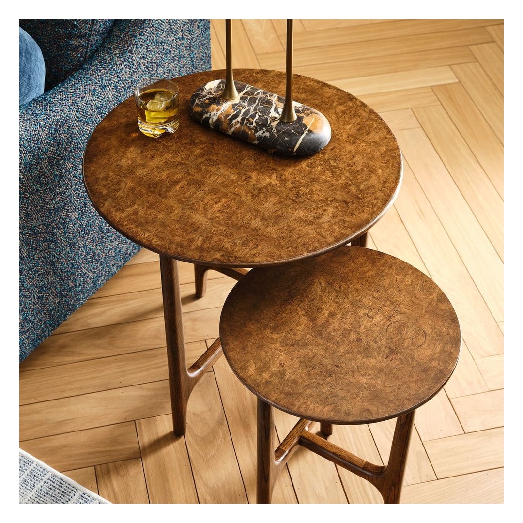 Inspirado en los diseños daneses de mediados del siglo XX, este conjunto de dos mesas apilables está hecho de roble blanco estadounidense macizo con tapas de raíz de roble blanco estadounidense. Las mesas se agrupan de manera elegante, pero también pueden colocarse de forma independiente.