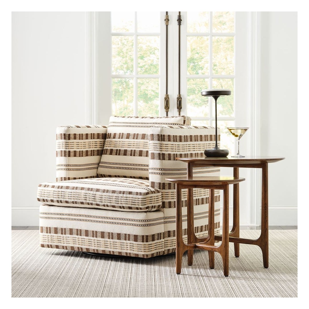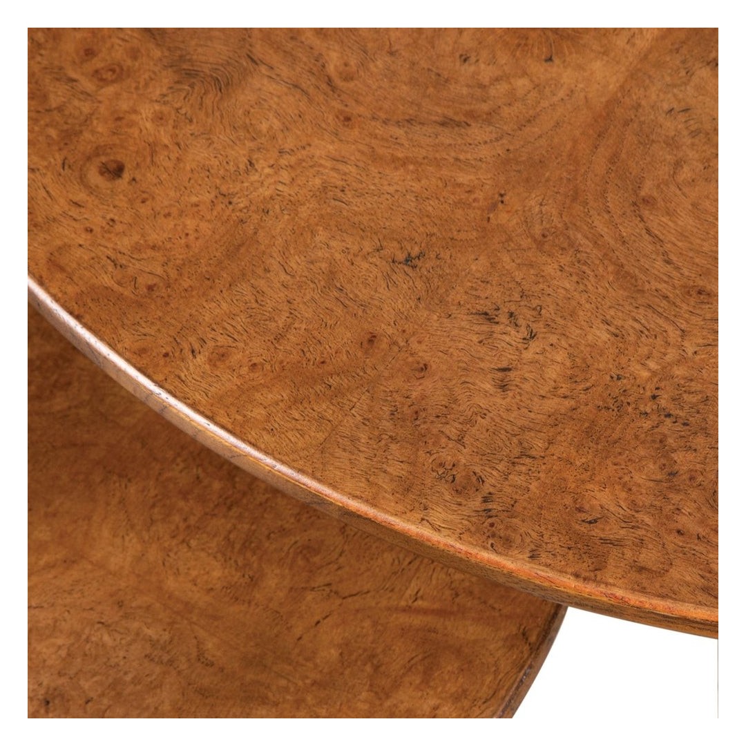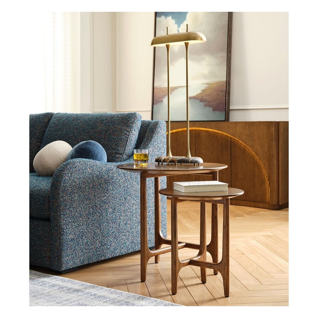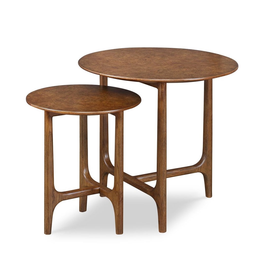 Inspirado en los diseños daneses de mediados del siglo XX, este conjunto de dos mesas apilables está hecho de roble blanco estadounidense macizo con tapas de raíz de roble blanco estadounidense. Las mesas se agrupan de manera elegante, pero también pueden colocarse de forma independiente.