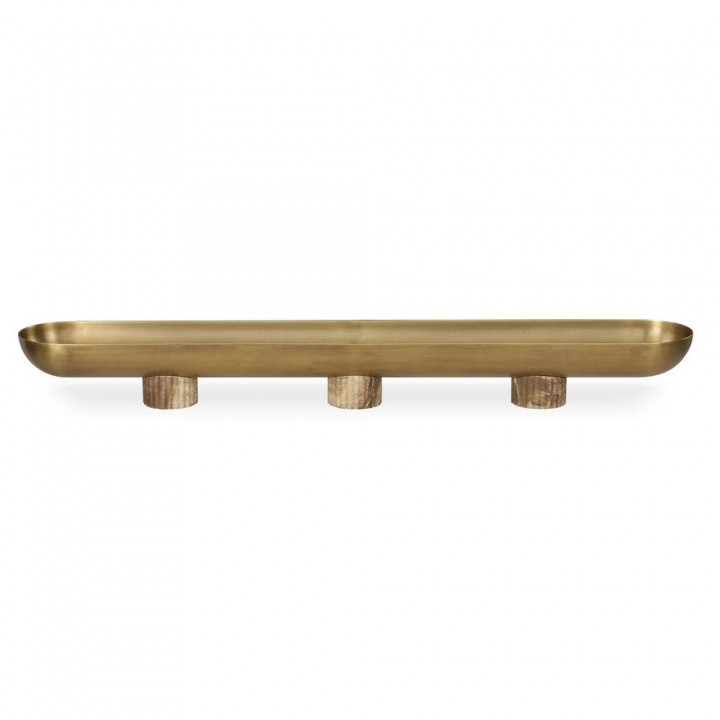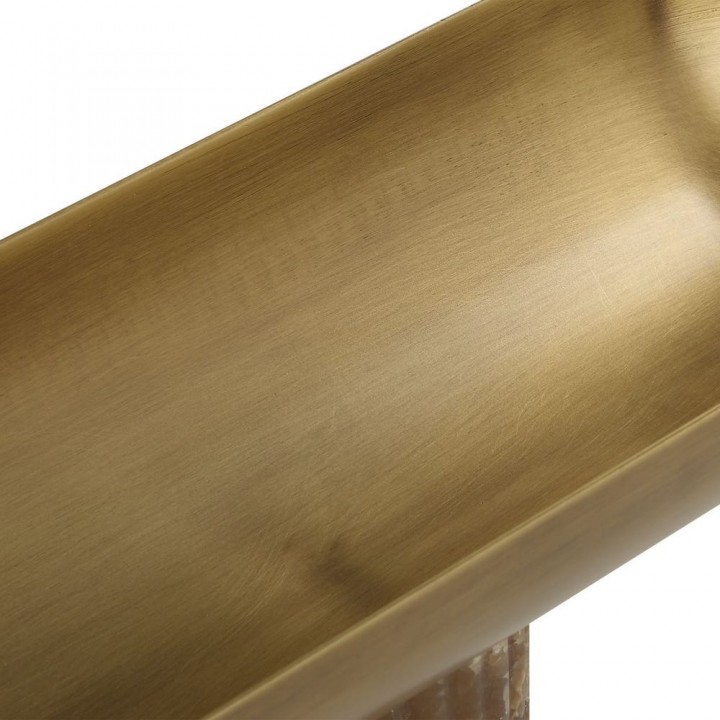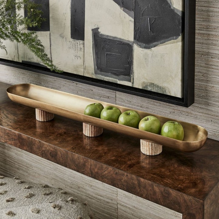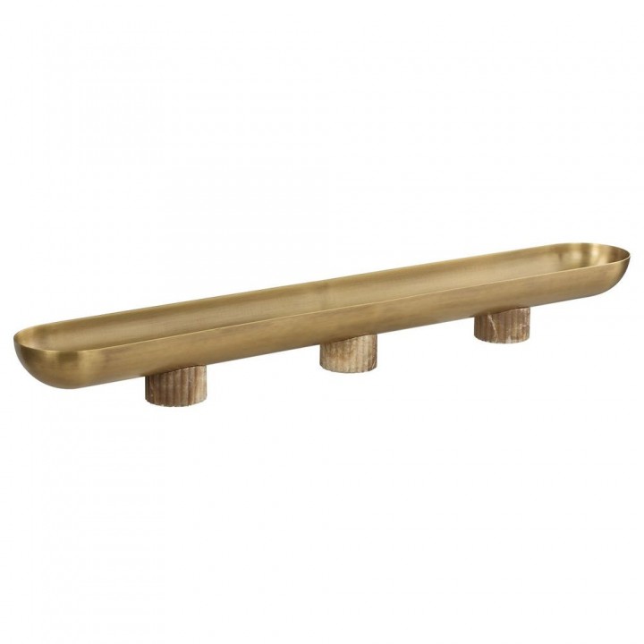 Bowl metálico alargado con acabado en latón antiguo claro, sostenido por tres pedestales acanalados en ónix latte. Una pieza central perfecta por sí sola o para exhibir una colección con elegancia.